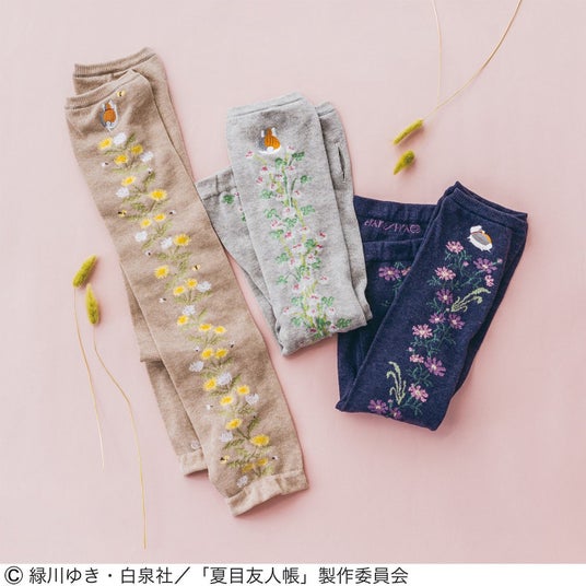ニャンコ先生のワンポイント刺しゅうがかわいくて、表面のUVカットが90%以上と機能的なアームカバーです。落ち着いたカラーのベースに、「夏目友人帳」の世界をイメージした野花があしらわれていて、ナチュラルでやさしい雰囲気に仕上げられています。デザインは〈シロツメクサ〉〈タンポポ〉〈コスモス〉の3種類です。