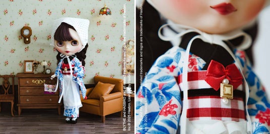 赤い実をつけたブルーの着物を、黒い衿と帯締めで引き締めたデザインがとってもキュートな和装キット。昭和モダンな雰囲気が魅力です。レースのヘッドドレスやエプロン、帯にあしらったリボンなど、色の組み合わせとパーツ選びにセンスが光ります。人気ドール着物作家のchimachoco(ちまちょこ)さんがデザインと監修を手がけるドールのための和装キット第三弾です。
