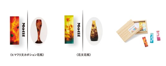 デザインは、〈紫陽花文花瓶〉〈葡萄文鉢〉〈マグノリア文花瓶〉〈ヒマワリ文カボション花瓶〉〈花文花瓶〉の5種類です。まとめて収納できる桐箱に入って届きます。贈り物にもおすすめです。