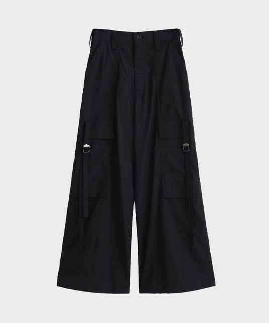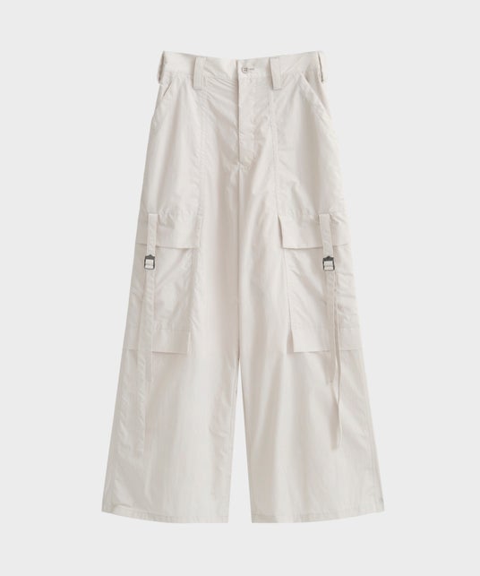 ウィメンズのインラインのパンツをフレアな形ながらストレート寄りの形にし、裾幅をメンズライクにアップデート。素材もナイロンタフタに変更