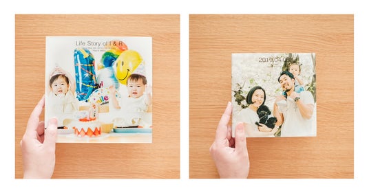 fotowaのフォトブックは気軽に家族の日々をコレクションしやすい「JOY(ジョイ)」と記念日の思い出を残すのに最適な高級厚紙製本の「STORY(ストーリー)」の2種類です。16ページは表紙1枚+本体12枚、24ページは表紙1枚+本体20枚、36ページは表紙1枚+本体32枚の写真が入ります。