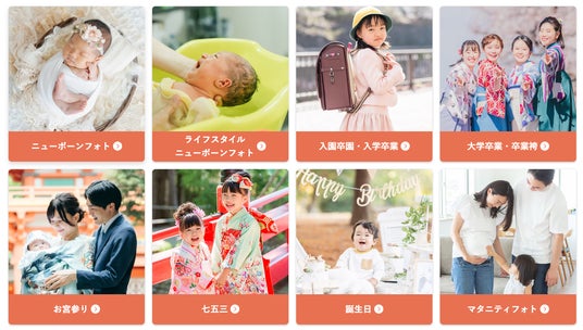 マタニティ、ニューボーン(新生児)、お宮参り、誕生日、七五三、卒入園・卒入学、成人式、結婚式の前撮り・後撮り、長寿祝いなど、ご家族の記念日はもちろん、日々の残したい愛おしさに寄り添う「わが家の専属フォトグラファー」として、全国のご家族にご利用いただいています。