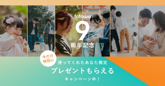 家族・子ども向け出張撮影プラットフォーム「fotowa(フォトワ)」(運営:ピクスタ株式会社 東京都渋谷区 代表取締役社長:古俣大介、東証グロース:3416)は、サービス開始9周年を記念し、ご利用いただいたご家族様へ感謝を込めて、fotowaのフォトブックを無料で作れるクーポンを、抽選で99名様にプレゼントする「fotowa 9th anniversary キャンペーン」を開始いたします。