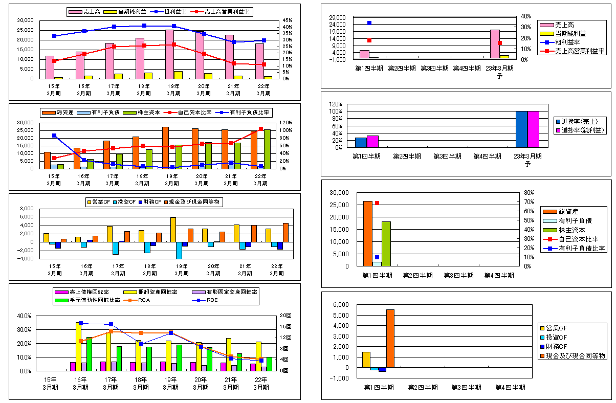 過去の経営成績を見ると、18年3月期に粗利率が40.9%とピークに達し、その後20年3月期には、28.6%にまで落ち込んだ。売上高も19年3月期から落込み、22年3月期まで減少し続けている。売上高の低下や粗利率の悪化、減価償却費の負担の増加により、19年3月期では26.4%だったが22年3月期には11.2%まで減少している。23年3月期の第一四半期では、粗利率、営業利益率は改善している。財務面をみると、有利子負債比率は9.375%となっており健全経営。気になるとするならば、有形固定資産回転率が悪化しているところ。