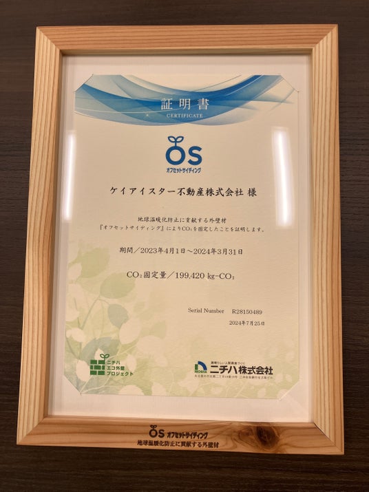 ケイアイスター不動産株式会社(本社/埼玉県本庄市、代表取締役社長/塙 圭二、以下「当社」)は、建築資材パートナーであるニチハ株式会社(本社/愛知県名古屋市、代表取締役社長/吉岡 成充、以下「ニチハ」)より、2023年4月1日から2024年3月31日における二酸化炭素(CO2)固定量を199,420kgとする認定を受けました。