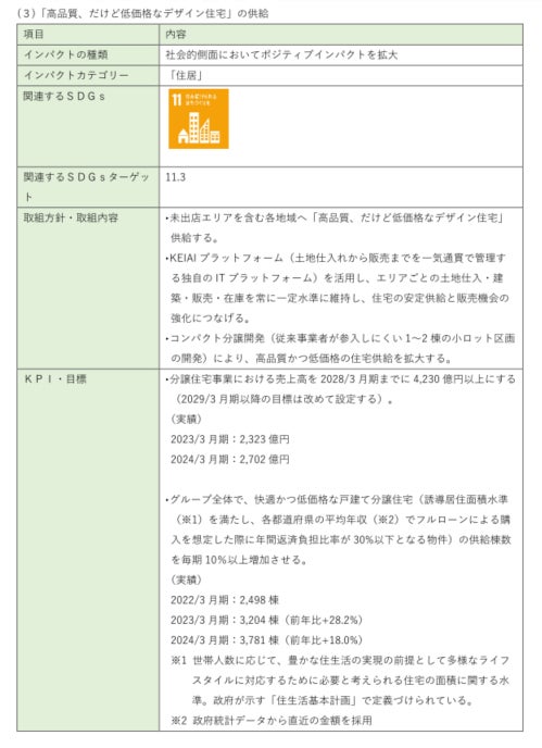 「豊かで楽しく快適なくらしの創造」を経営理念に、「すべての人に持ち家を」をビジョンに掲げ、『高品質、だけど低価格なデザイン住宅』を提供しています。仕入から販売までを一気通貫で行うリアル×テクノロジーの基盤である「KEIAIプラットフォーム」を構築。テクノロジーの積極的な導入とコンパクト戸建住宅による独自のビジネスモデルによって、国内分譲住宅市場シェアの拡大を図ります。今後も不動産業界のDXを牽引するリーディングカンパニーとして、価値ある分譲住宅を提供していきます。
