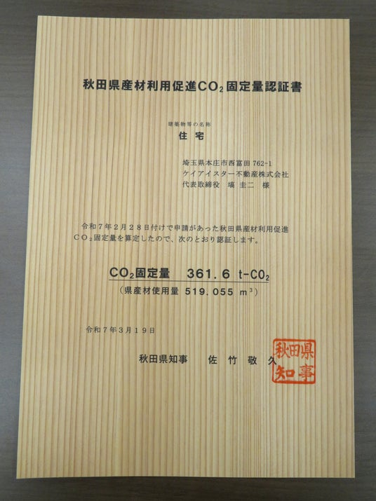 ケイアイスター不動産株式会社(本社/埼玉県本庄市、代表取締役社長/塙 圭二、以下「当社」)は、秋田県が県産木製品の利用促進のために創設した「あきた材パートナー」として、二酸化炭素(CO2)固定量(※1)を361.6 t-CO2(県産材使用量 519.055㎥)(※2)の認証を秋田県知事より拝受しました。