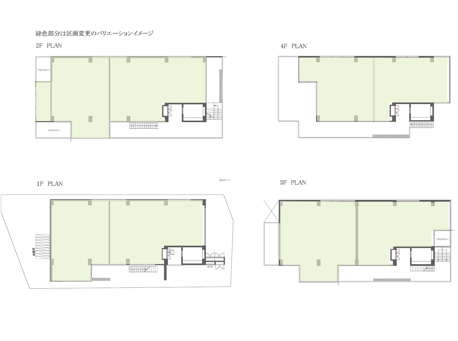 建築が長期的な需要に、柔軟に対応しながら継続していくためにも、社会情勢による用途転用がしやすい状態をつくり、地域や次世代に寄与していくことを目指しています。区画変更をしやすくするため、1フロア2区画のシンプルなフレームとし、界壁は非構造壁とすることで隣接区画の一体利用も想定しています。