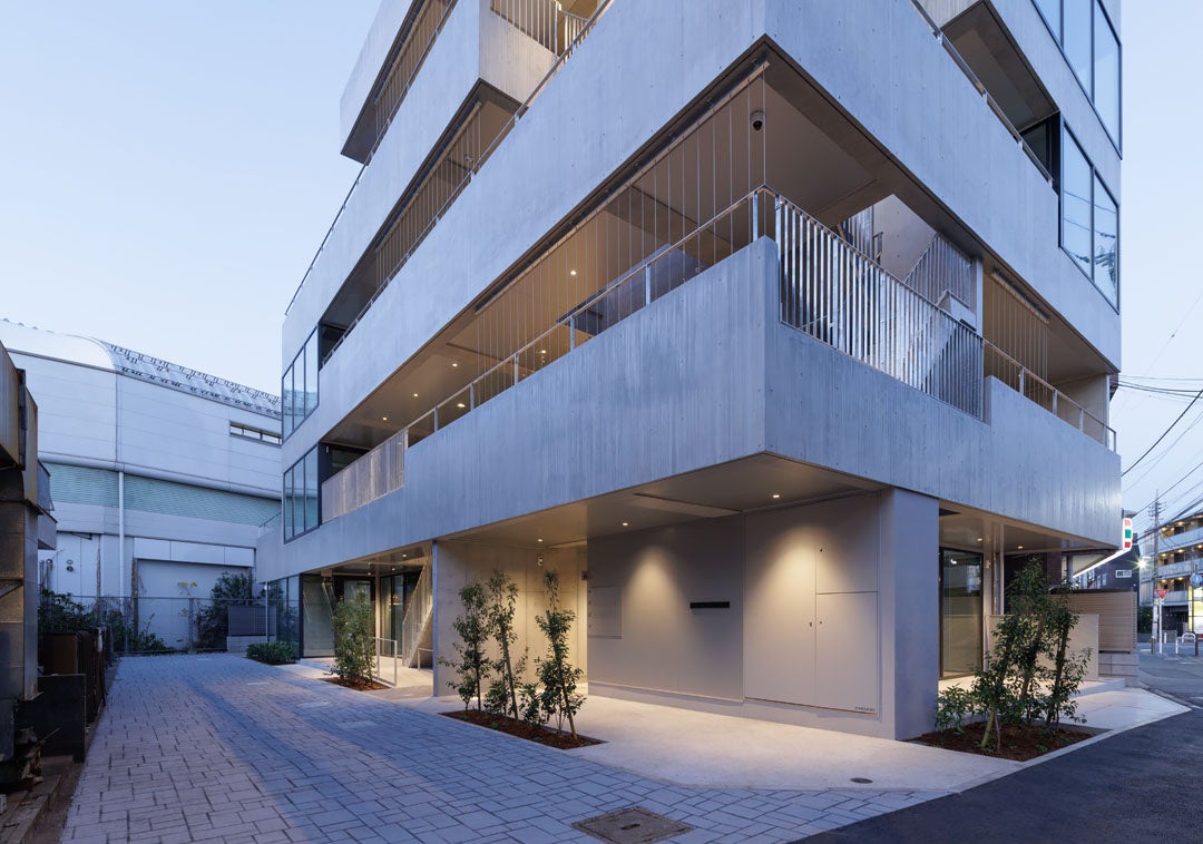 主に接道している道路は歩行者が行き交うため、壁面にはそのスケールを受け止め、奥行きを演出するため緑を配置し、建物と歩行者の関係をつなげる役割を持たせています。また、ファサードとしての役割は前面道路を拡張した場所としても機能させることを意図しています。
