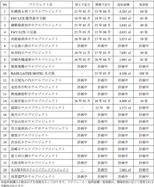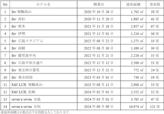 当社は、観光立国の実現や地域創生への貢献を目的にホテルの開発に取り組んでおり、多人数向けホテルブランド(『fav』『FAV LUX』『seven x seven』)、およびカルチャービジネスホテル『BASE LAYER HOTEL』を全国で展開しております。