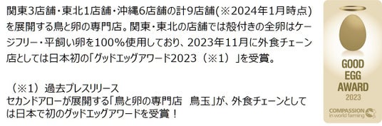 株式会社串カツ田中ホールディングスの子会社、株式会社セカンドアロー(本社:東京都品川区東五反田、代表取締役社長:大須賀 伸博 以下、セカンドアロー)は、日本の外食チェーンで初のグッドエッグアワードを受賞した「鳥と卵の専門店 鳥玉」(以下、鳥玉)にて、2024年12月2日(月)より、「牡蠣と鶏肉の卵とじ丼」を期間限定で販売開始します。