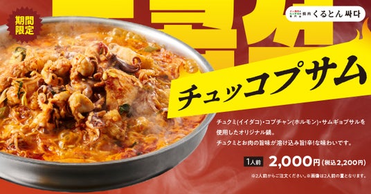 今が旬のチュクミ(イイダコ)と、コプチャン(ホルモン)、看板メニューの「サムギョプサル」を使用した、くるとんオリジナル鍋料理が誕生!その名も「チュッコプサム」!韓国の人気海鮮鍋「ナッコプセ」を、くるとん流にアレンジしました。