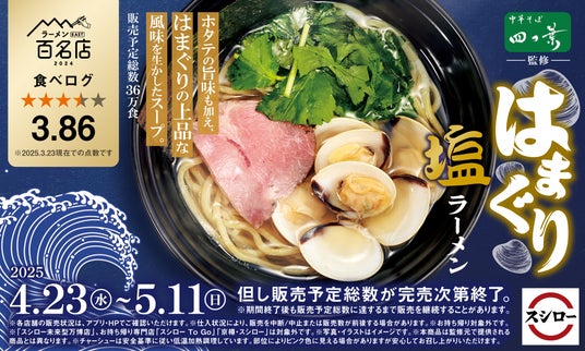 株式会社あきんどスシロー(本社:大阪府吹田市、代表取締役社長:新居 耕平)は、レストラン検索・予約サービス「食べログ(https://tabelog.com/)」とコラボをし、「スシロー×食べログ」全国名店監修シリーズを実施しております。この度は4月23日(水)から、食べログで点数3.86の高評価を獲得し、2017年から「食べログ ラーメン EAST 百名店」に選出されている、埼玉の人気ラーメン店、“中華そば 四つ葉”監修の「はまぐり塩ラーメン」を全国のスシローにて販売いたします。