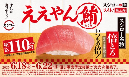 株式会社あきんどスシロー(本社:大阪府吹田市、代表取締役社長:新居 耕平)は、6月に創業月を迎えることから、今年一番の感謝の気持ちを込めて『年に一度の超恩返し!2025スシローの日』を開催中です。この度、第三弾を6月18日(水)より開催し、スシロー名物「倍とろ」を税込110円~ご提供いたします。