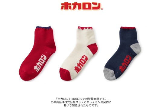●デザイン:足裏に大きなレトロかわいい「ホカロン」のロゴがデザインされたショート丈のルームソックス。裏起毛総パイル編みなので、足元を温かく包み込み、履き口は締め付けにくくやわらか。足底滑り止め付き。リラックスタイムや冷え性対策、大切な人へのプレゼントにもおすすめです。