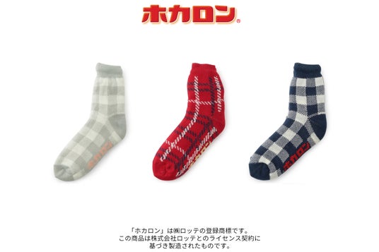 ●デザイン:二重編み裏ボアで足元温か。レトロかわいい「ホカロン」のロゴがデザインされたルームソックス。温かみのあるチェック柄が特長で、お部屋のリラックスタイムにもぴったりです。内側ボア仕様なので、足元を温かく包み込みます。足底滑り止め付き。