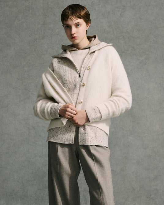 冬のLOOKBOOKでは、柔らかく暖かみのあるフォックス混の風合いが魅力のカーディガンや、Iラインで細身ながらもローゲージニットやジャケットにも羽織れるゆとりを持たせたスタンドカラーコート、コーディネートに暖かみと奥行を加えるバイカラーストールなどを展開しています。