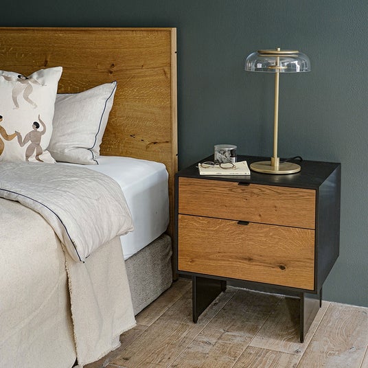 高さ違いの2段の引き出しが、ベッドまわりの小物をすっきりとまとめます。