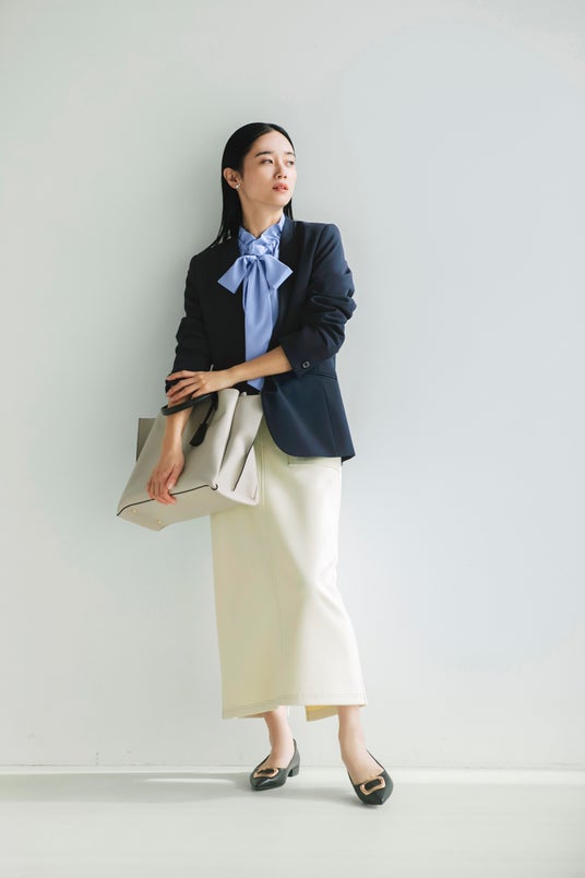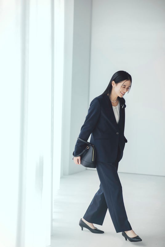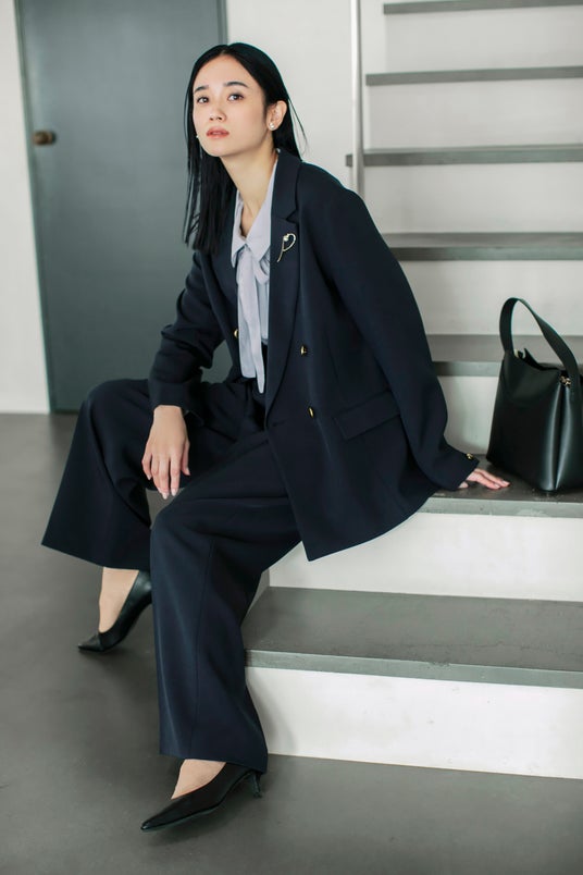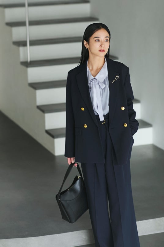 “王道カラーのネイビーをセットアップで品よく魅せる”