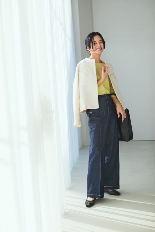 “ダブルジャケット×ワイドパンツでよりスタイリッシュな着こなしに”