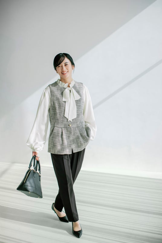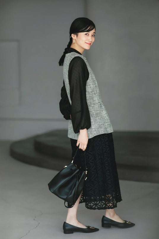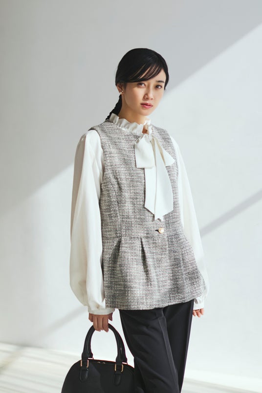 “ペプラムツイードジレできちんと&品の良さを演出”