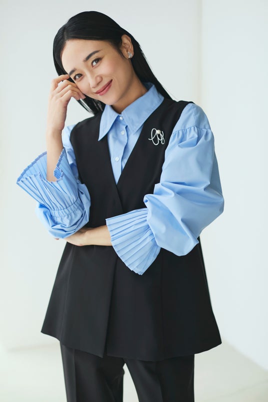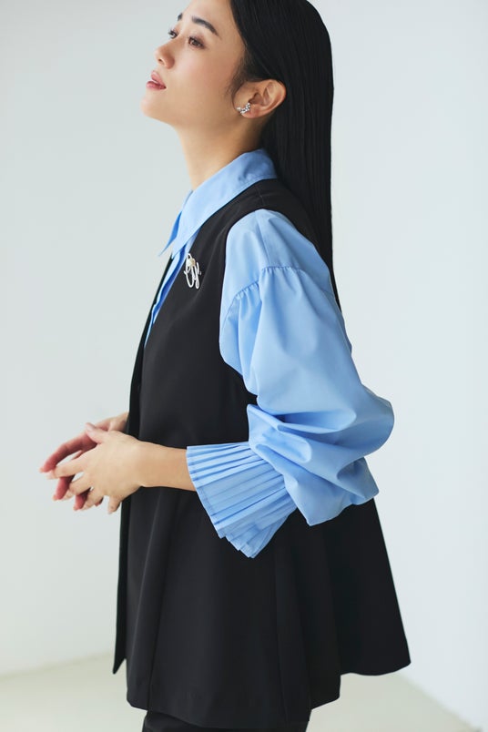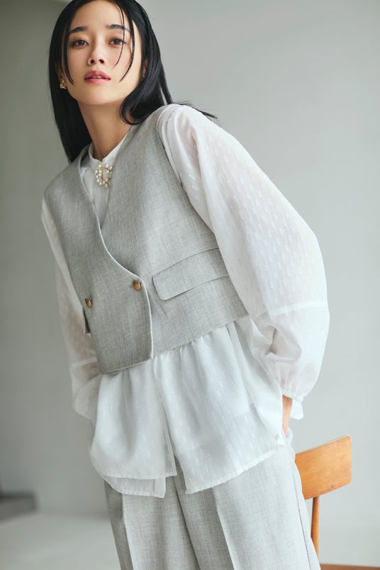 “ショート丈ジレ×パンツ シアーブラウスで旬な着こなしに”