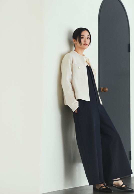 “ツイードジャケットで作るフォーマルシーンにもマッチするサロペスタイル”