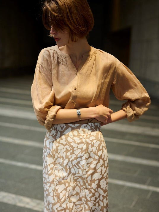 綿や麻などの天然混素材と適度なツヤ感を持つ素材を使用した女性らしいデザインとシルエットにこだわったワードローブを展開しています。