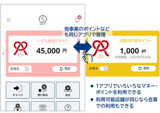- 今後出雲市が展開する給付やポイント施策や、山陰の他地域における地域通貨等も利用可能