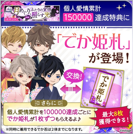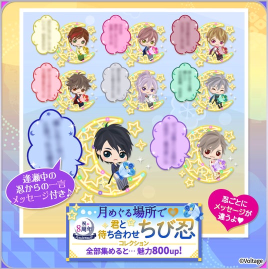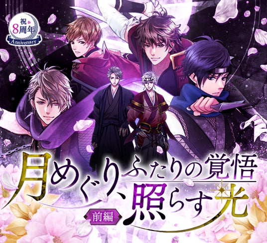 今年は「月めぐる場所で、君と待ち合わせ」をテーマに、全8キャラクターが登場するストーリーイベントの開催や、8周年の記念ビジュアルが楽しめる絵巻セット販売のほか、上位賞には新作物語の制作が決定している投票イベント「忍-1ぐらんぷり」も開催いたします。