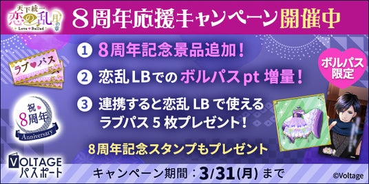 毎日の胸きゅんが貯まる!無料会員ポイントサイト「VOLTAGEパスポート」(以下、「ボルパス」)にて「恋乱LB」月の章8周年応援キャンペーンを開催しております。