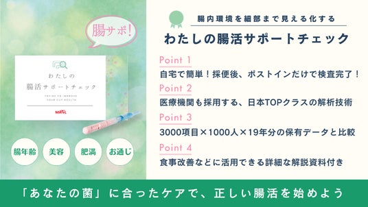 当社の連結子会社である株式会社ミルテル(本社:広島県広島市、代表取締役社長:加藤 俊也 以下、「ミルテル」)は、株式会社ウーマンスタイル(本社:石川県金沢市、代表取締役 成田由里)が運営する発酵食大学にて、2024年10月1日よりLINE完結型の腸活サポート検査サービス「わたしの腸活サポートチェック」(以下、「腸サポ」)の販売を開始し、ご好評いただいております。