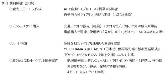 具体的には、観光WEBサイト「アットヨコハマ」上で、当社従来の機能である公共交通サービスの経路案内に加え、カーシェアリングやシェアサイクル・電動キックボードなど多彩なモビリティサービスの活用を可能にし、神奈川県や横浜に訪れた皆様に、より効率的な経路検索を案内する複合経路検索機能とその利用ができるWebページを提供いたします。
