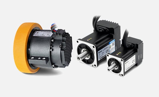 KincoのAGV・AMR・AGF向けのサーボホイール(左)及び一体型サーボモーター(右)。エンコーダー、サーボドライブ、モータを一体化し省配線、コンパクト化を実現しています。