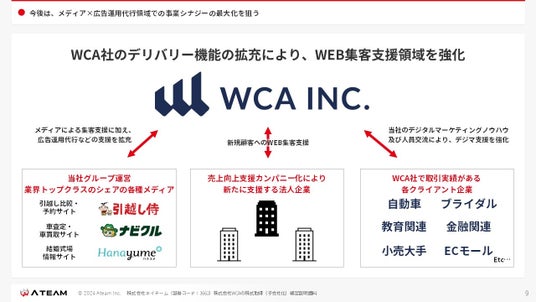 株式会社エイチーム(本社:愛知県名古屋市、代表取締役社長:林高生)は、2024年12月26日の取締役会において、WEB広告運用代行業などを展開する株式会社WCA(本店所在地:東京都港区、代表取締役:青嶋 剛史、以下「WCA社」)の発行済株式の100%を取得し、連結子会社化することを決議いたしました。