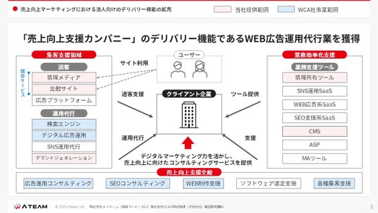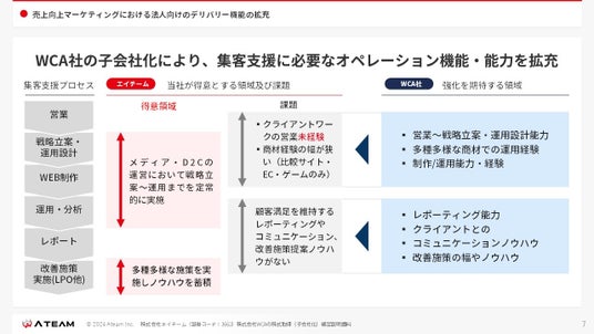 WCA社は、売上向上支援カンパニーのデリバリー機能を担う「WEBマーケティングコンサル・WEBマーケティング運用代行」事業を展開しております。当社がこれまで培ってきたデジタルマーケティング力を活かして法人向けに売上向上マーケティングを提供するために、クライアントとの接点を確保するデリバリー機能は重要な機能であり、売上向上支援カンパニー化に向けた連続的なM&Aの第一弾として、本株式取得を決議いたしました。
