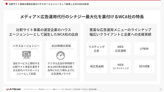 本株式取得後、当社グループとWCA社は両社の強みを掛け合わせ、足りないリソースやアセットを補完し合うことにより、売上向上に必要なソリューションの拡充を図ります。今回の子会社化により、当社が運営する比較サイトで提携している既存クライアントに対してメディアによる集客支援に加えて、広告運用代行での支援を拡充するなど深度あるアプローチを行います。また、新規顧客を開拓することでWCA社単体の売上も伸長させるとともに、コストの見直しによる利益確保も進めてまいります。WCA社は、当社がメディアとして既に展開している自動車関連事業、ブライダル関連事業だけでなく教育関連等も得意分野としており、サービス間のシナジー創出を行い、さらなる成長を目指してまいります。