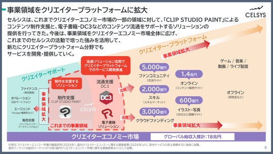 セルシスは、これまでクリエイターエコノミー市場の一部の領域に対して、「CLIP STUDIO PAINT」によるコンテンツ制作支援と、電子書籍・DC3などのコンテンツ流通をサポートするソリューションの提供を行ってきました。今後は、事業領域をクリエイターエコノミー市場全体に広げ、これまでのセルシスの活動で培った強みを活用して、新たにクリエイタープラットフォーム分野でもサービスを開発・提供していきます。