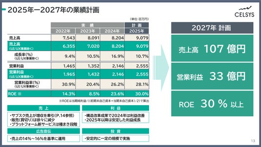 2027年には売上高107億円、営業利益33億円、ROE30%以上を計画しています。