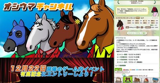 株式会社モブキャストホールディングス(本社:東京都港区、代表取締役CEO:藪考樹)の子会社で共に「クリエイター共創経営」を推進するNINJIN株式会社(本社:東京都港区、代表:吉田安寛)は、競走馬ファン待望の新感覚ゲーム&SNS競馬アプリ『オシウマチャンネル』において、年末恒例のG1レース「有馬記念」を題材としたゲーム内イベント「有馬記念イベント」を12月22日(日)に開催することをお知らせします。本イベントの開催は、リアル競馬と連動しながら新たな競馬エンターテインメント体験を提供し、アクティブユーザー数の増加やコミュニティの活性化を目指すものです。今後もリアル競馬との連動イベントにより、本アプリの成長基盤を一層強化してまいります。