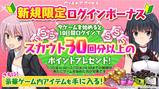 ●『新規限定ログインボーナス』実施中!1月10日(金)以降にゲームを開始したお客様を対象に、スカウト30回分以上の「スカウトポイント」などのアイテムがもらえるログインボーナスを実施しております。