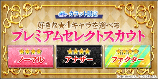 ●『プレミアムセレクトスカウト』開催中!カラットを使用して1回限り、選んだ★4キャラを1人確定でスカウトできる「プレミアムセレクトスカウト」が開催中です。ノーマル、アナザー、ファクターの3種のスカウトを順次開催いたしますので、この機会をお見逃しなく。