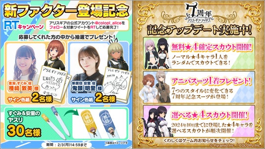 2025年1月22日(水)にリリース7周年を迎えたことを記念して、最高レアの★4キャラクター1人を確定入手できる無料スカウトや7周年記念コスチュームの1着無料プレゼント、また、新ファクターキャラクター「金潟 すぐみ【クリエイト】(CV:種崎 敦美)」と「新居目 安里【クリエイト】(CV:鬼頭 明里)」の登場など、ゲーム内にて様々なキャンペーンやアップデートを実施しております。