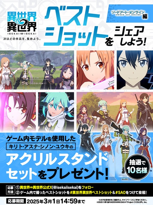 株式会社コロプラ(代表取締役社長 上席執行役員 CEO:宮本貴志、本社:東京都港区、以下「コロプラ」)は、スマートフォン&PCでもっと異世界を楽しむ新作ゲーム『異世界∞異世界』(いせかいいせかい)にて、本日2025年2月18日(火)より人気アニメ作品「ソードアート・オンライン」とキャラクターたちが登場していることをお知らせいたします。
