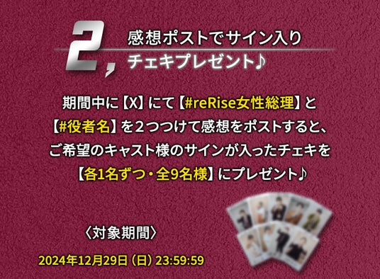 X(旧:Twitter)でハッシュタグ「#reRise女性総理」と「#役者名」を2つ付けて作品の感想をポストすると、ポストしてくださった方の中からご希望のキャスト様のサイン入りチェキを抽選で各1名ずつ、全9名様にプレゼントいたします。