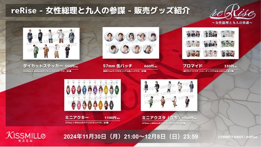 「reRise - 女性総理と九人の参謀 -」の配信を記念して、オリジナルグッズを予約販売致します。ダイカットステッカーや缶バッチ、ミニアクリルキーホルダーなどを期間限定で販売いたします。ぜひグッズでも「reRise - 女性総理と九人の参謀 -」をお楽しみください。