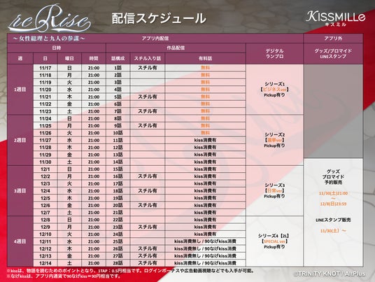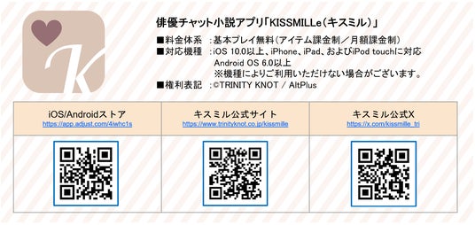 株式会社オルトプラス(本社:東京都豊島区、代表取締役CEO:石井武、以下「オルトプラス」)は、株式会社トリニティノットと共同運営中の俳優チャット小説アプリ「KISSMILLe(キスミル) 」(以下、「キスミル」)にて、人気俳優とコラボレーションした作品「reRise - 女性総理と九人の参謀 -」を2024年11月17日(日)より連載開始することをお知らせいたします。