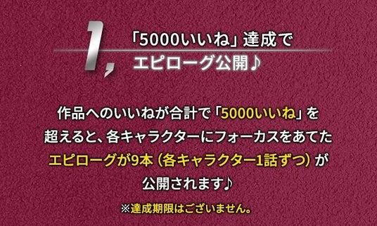 作品への「いいね」数が合計で「5,000いいね」を超えると、各キャラクターにフォーカスをあてた特別なショートストーリー(フルボイス)が9本(各1話ずつ)公開いたします。
