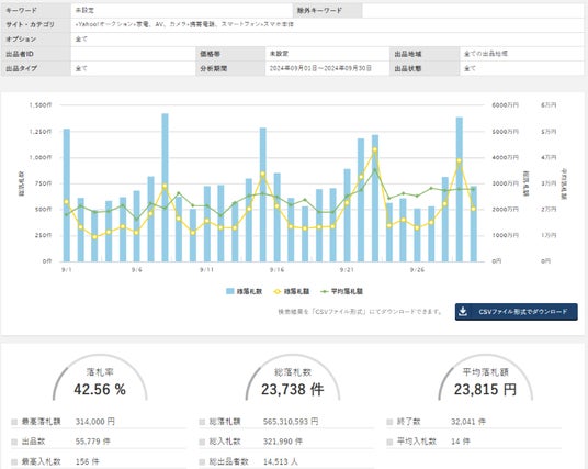 誰がいつ何をいくらで売り、その商品がどのくらい売れているか、約700億件の売買データを解析し、その分析結果を提供しています。今の価格だけでなく、長期的な価格推移やトレンド商品の閲覧も可能です。