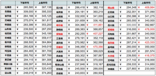 ドラピタ掲載求人における都道府県別の平均給与において、上限平均では岐阜県、愛知県、京都府、岡山県、愛媛県、佐賀県、大分県の7府県が上位に位置し、各府県の月額平均給与は40万円を超えました。